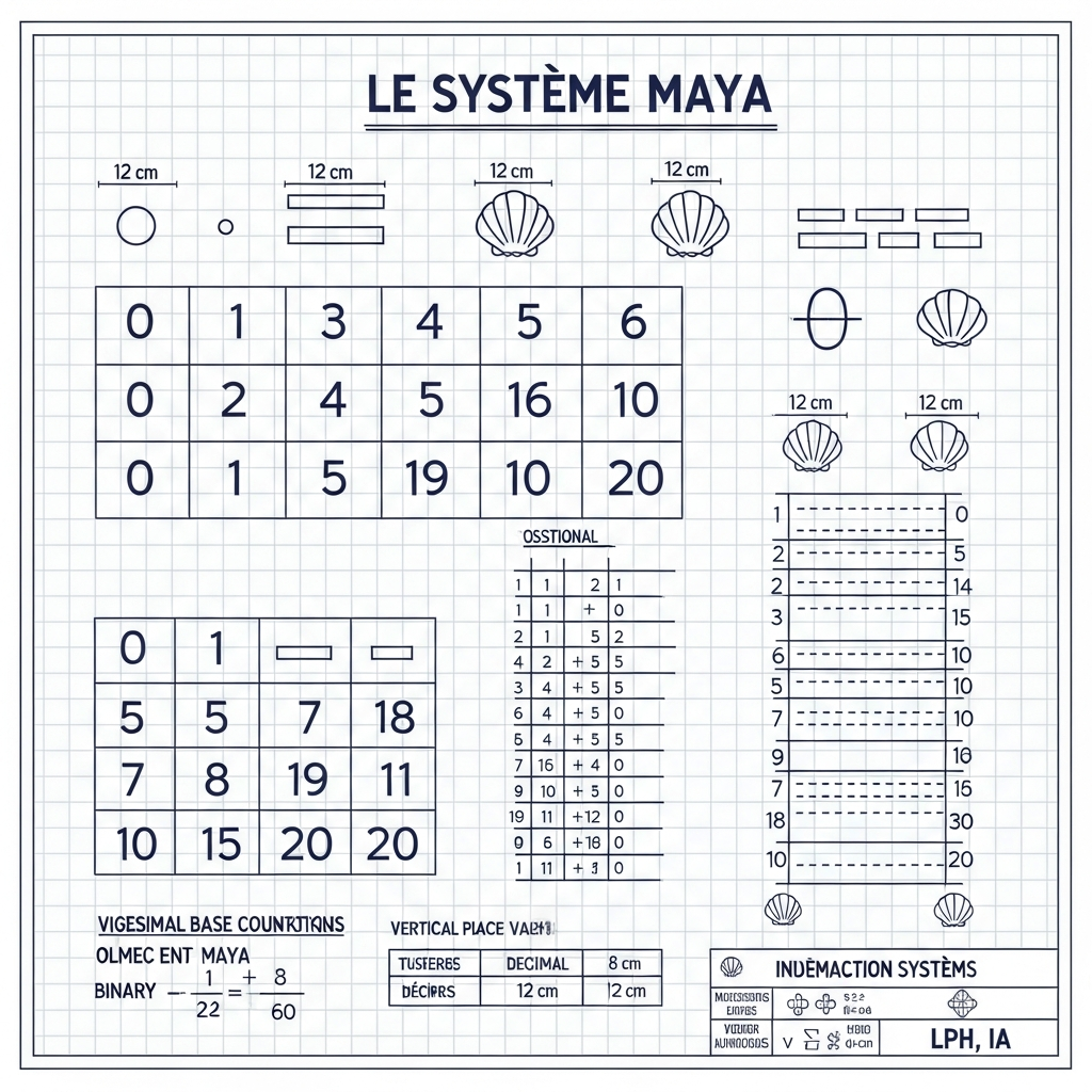 Les Olmèques, puis les Mayas qui héritèrent de leur savoir, avaient résolu le problème bien avant. Leur système vigésimal — en base vingt, probablement parce que les anciens comptaient sur leurs doigts et leurs orteils — utilisait seulement trois symboles : un point pour un, une barre pour cinq, et une coquille pour zéro. Avec ces trois éléments, ils pouvaient représenter n'importe quel nombre, écrire des dates s'étendant sur des millions d'années, calculer les trajectoires des planètes.