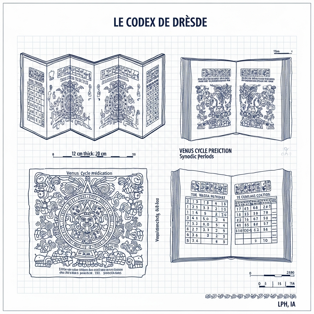 Le Codex de Dresde, bien que copié à une époque postérieure, préserve des tables astronomiques dont l'origine remonte à l'Antiquité maya. Ces tables permettaient de calculer les positions de Vénus des siècles à l'avance. Elles témoignent d'une tradition d'observation systématique qui s'étendait sur des générations, accumulant des données et affinant les modèles.