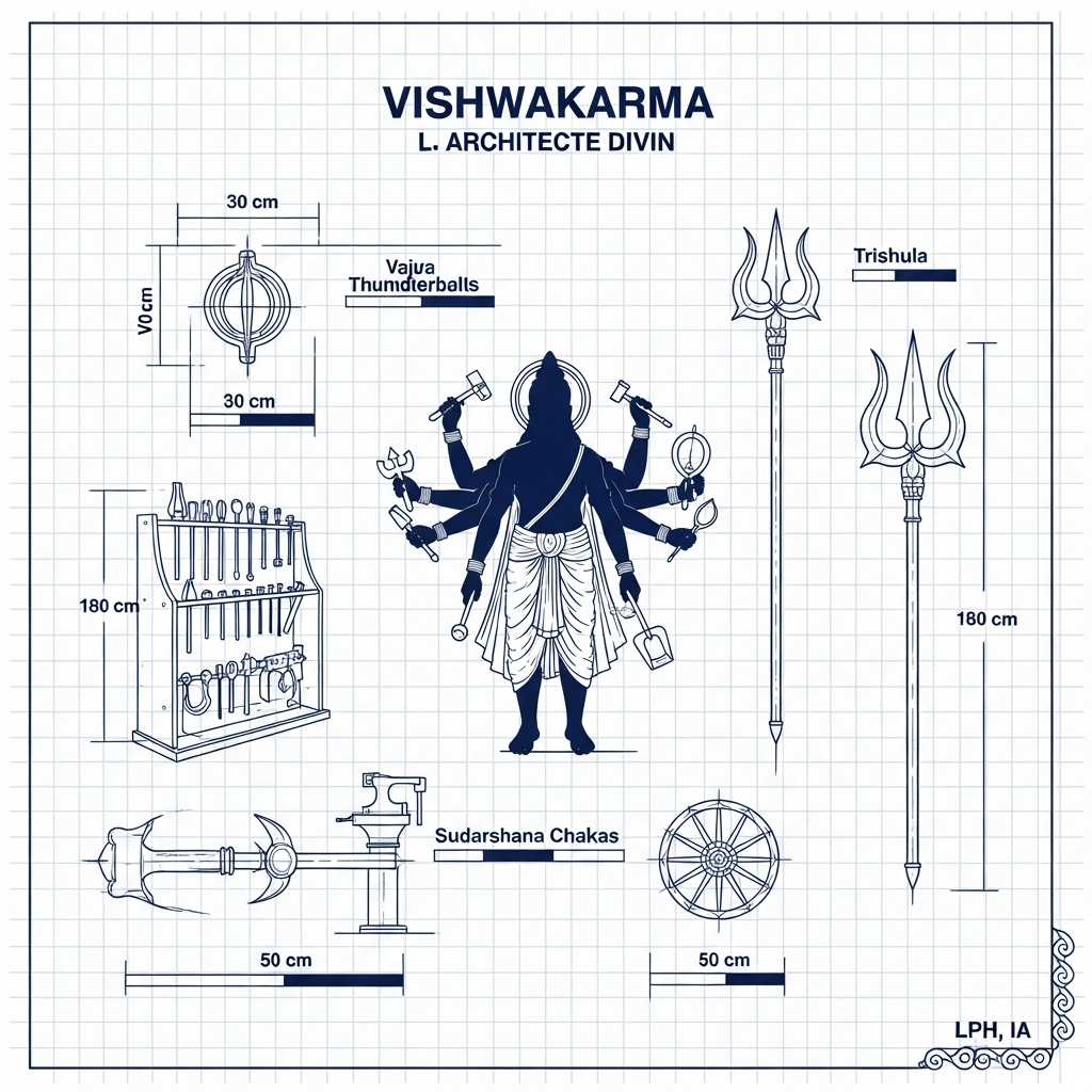 Avant même que les philosophes grecs ne formalisent les règles de la logique, l'Inde védique avait déjà imaginé ses propres créateurs d'êtres artificiels. Au sommet de ce panthéon technique trônait Vishwakarma, dont le nom signifie littéralement « celui qui fait tout ». Architecte divin, ingénieur cosmique, il était à la fois le bâtisseur de l'univers et le fabricant des armes célestes. De ses ateliers sortaient les foudres d'Indra, le trident de Shiva, le disque tournoyant de Vishnou — et surtout, le Pushpaka Vimana.