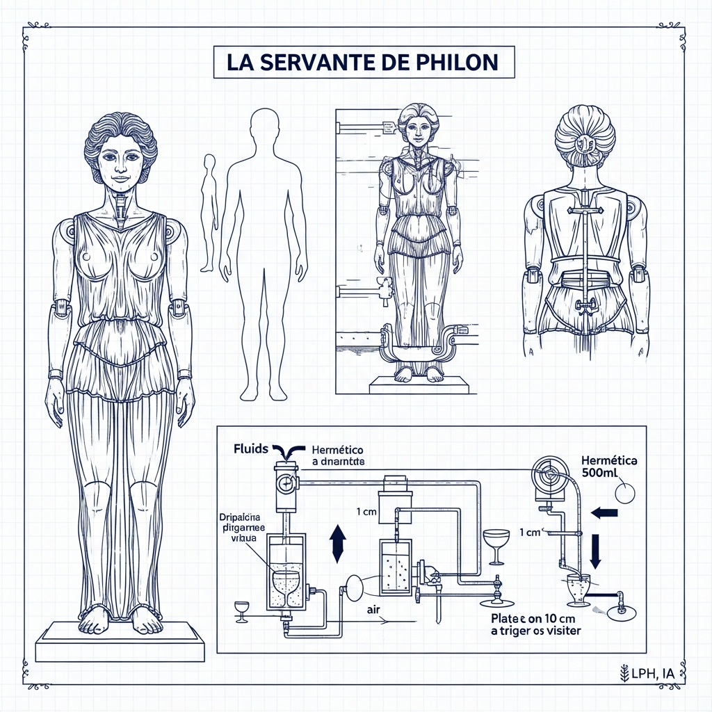 C'est à Alexandrie, carrefour de l'Égypte et de la Grèce, que ces traditions convergèrent pour donner naissance à une véritable science de l'automatisation. Ctésibius, que l'on tient pour le père de la pneumatique, construisit au troisième siècle avant notre ère des horloges à eau d'une précision inégalée pendant deux millénaires, un orgue actionné par la pression hydraulique — le premier instrument à clavier de l'histoire —, et d'innombrables dispositifs de divertissement. Son élève Philon de Byzance alla plus loin encore : il créa une servante mécanique grandeur nature, capable de verser automatiquement du vin puis de l'eau dans la coupe d'un visiteur. Le mécanisme reposait sur des conteneurs hermétiques, des tubes d'air, et un jeu subtil de gravité et de pression. La servante n'avait pas de conscience, mais elle avait un comportement — une séquence d'actions déclenchées par un stimulus externe.