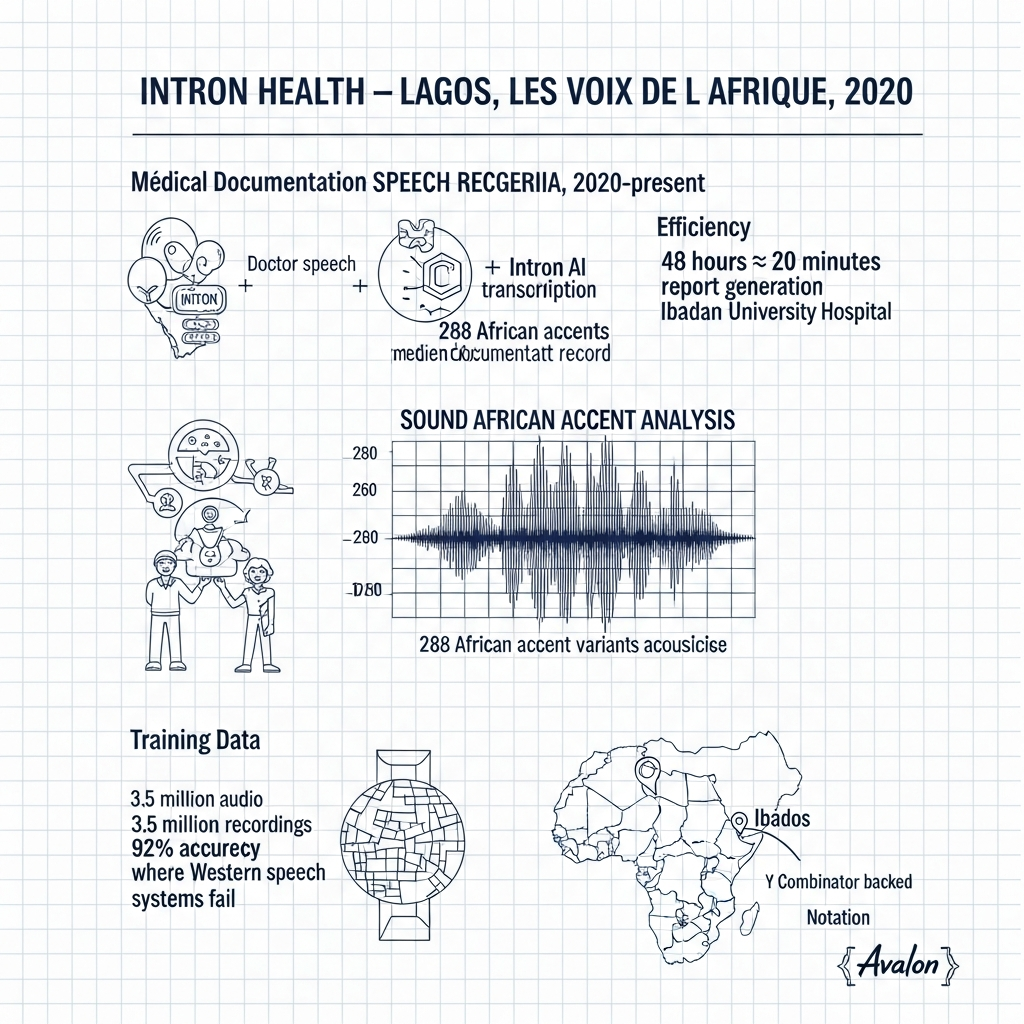 Le résultat fut spectaculaire. À l'hôpital universitaire d'Ibadan, le délai de rédaction des rapports radiologiques passa de quarante-huit heures à vingt minutes. Plus de cinquante-six mille patients bénéficièrent du système dans une trentaine d'hôpitaux publics et privés. Intron Health avait constitué le plus grand ensemble de données de parole clinique africaine — plus de trois millions et demi d'enregistrements audio couvrant deux cent quatre-vingt-huit accents africains.