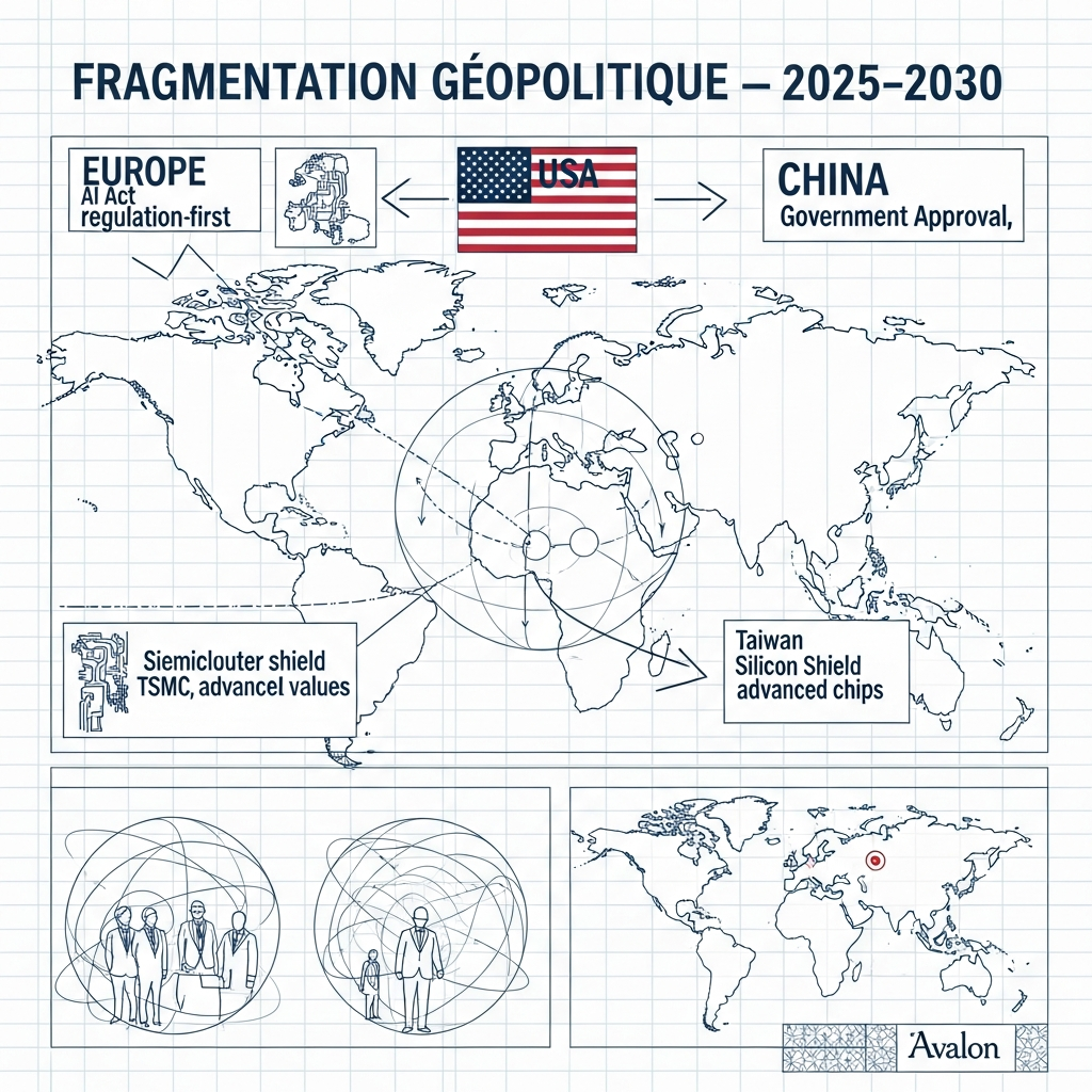 Le monde de l'IA se balkanise. Les modèles entraînés en Chine ne fonctionnent pas comme ceux entraînés aux États-Unis. Les données européennes ne traversent pas les frontières comme les données américaines. L'interopérabilité devient un défi géopolitique.