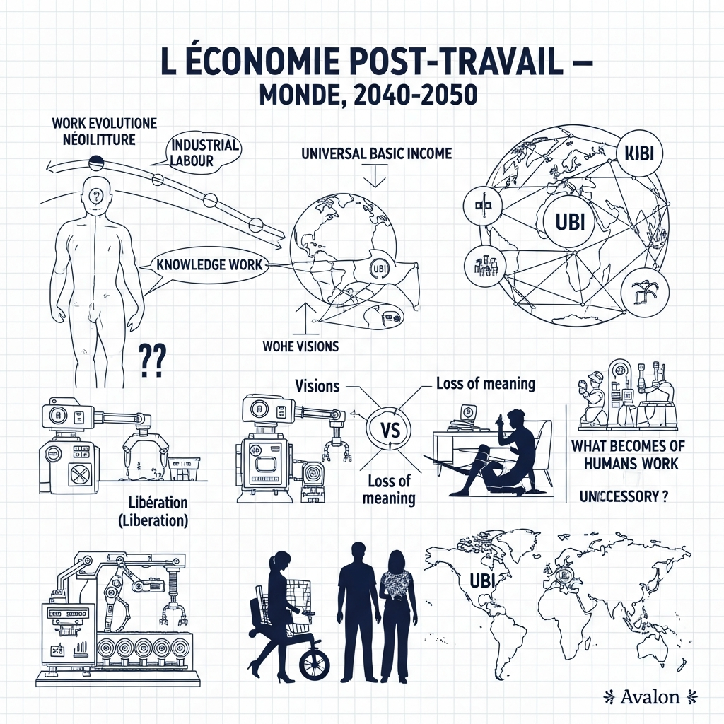Les modèles économiques devront évoluer. Le revenu universel de base — une allocation versée à tous indépendamment du travail — passera de l'idée marginale au débat central. D'autres modèles émergeront : propriété collective des systèmes d'IA, taxation des robots, économie du temps libre, économie de la contribution.