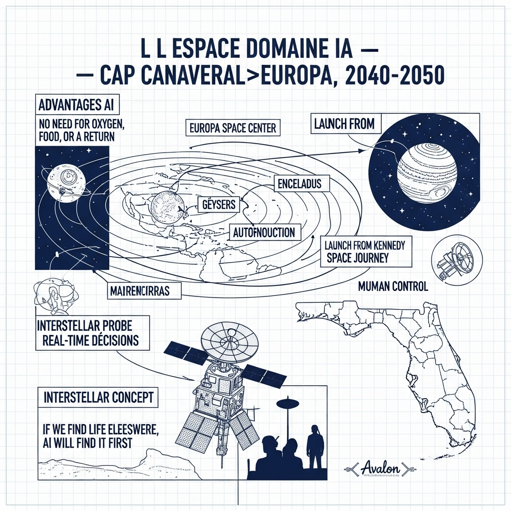 Les sondes autonomes capables d'explorer, d'analyser, de décider sans intervention humaine sont déjà en développement. D'ici 2050, des systèmes d'IA pourraient explorer les lunes de Jupiter et de Saturne, construire des infrastructures sur Mars, peut-être voyager vers d'autres étoiles.