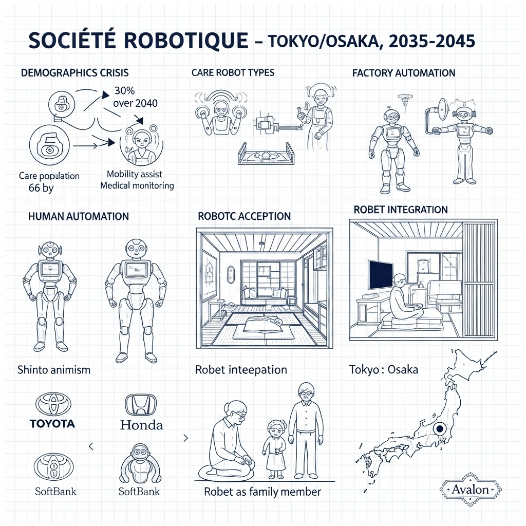 L'horizon moyen (2031-2036) est celui de la transformation. L'AGI — atteinte ou imminente — redéfinit ce que signifie « intelligence ». Les robots humanoïdes entrent dans nos vies. La science s'accélère. Le monde se divise en sphères technologiques. La littératie en IA devient universelle. Les signaux restent forts, mais les contours s'estompent.