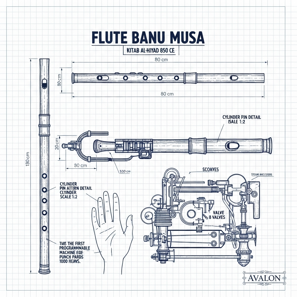 La plus remarquable est une flûte automatique capable de jouer différentes mélodies selon la configuration de cylindres interchangeables. Le son était produit par de la vapeur chaude, et l'utilisateur pouvait ajuster l'appareil pour obtenir différents motifs musicaux. Une méthode similaire aux cartes perforées. Mille ans avant les premiers ordinateurs, ces trois frères de Bagdad avaient construit la première machine programmable de l'histoire.