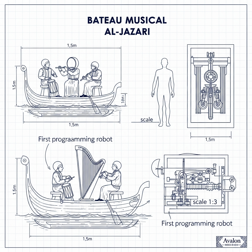 Al-Jazari y décrit des automates d'une sophistication stupéfiante. L'un d'eux est un bateau transportant quatre musiciennes mécaniques — deux joueuses de tambourin, une harpiste et une flûtiste. Le bateau se déplace réellement sur l'eau, alternant moments de navigation et moments où l'orchestre joue, le tout contrôlé par le débit de l'eau. Les tambours peuvent jouer différents rythmes selon la position de pions ajustables : des programmes mécaniques, en somme. Beaucoup d'historiens considèrent ce bateau comme le premier "robot" programmable de l'histoire.