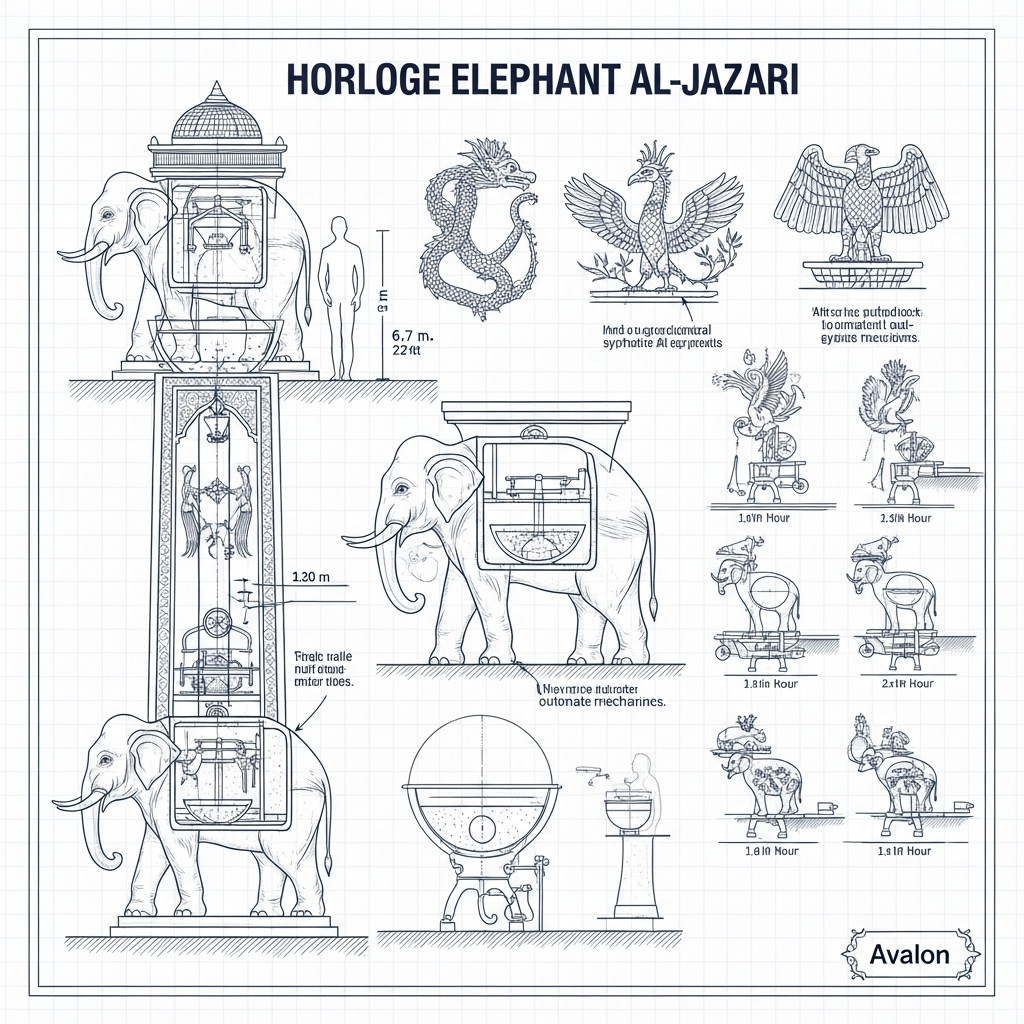 Deux siècles et demi plus tard, à Diyarbakır en Anatolie, un ingénieur du nom d'Ismail al-Jazari pousse cette logique encore plus loin. Né en 1136, il sert comme ingénieur royal au palais des Artuqides pendant l'apogée de l'Âge d'or islamique. En 1206, il publie son chef-d'œuvre : le Livre de la connaissance des procédés mécaniques.